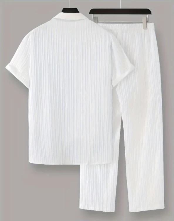 2-Piece Men's Stylish Spring Summer Vacation Outfit Set – Ruffled Short Sleeve Lapel Shirt & Drawstring Long Pants Step up your vacation style with this 2-piece Men's Stylish Spring Summer Outfit Set, designed for those who appreciate fashion and comfort. This set includes a trendy ruffled short sleeve lapel shirt paired with matching drawstring long pants, perfect for any warm-weather occasion. Features: