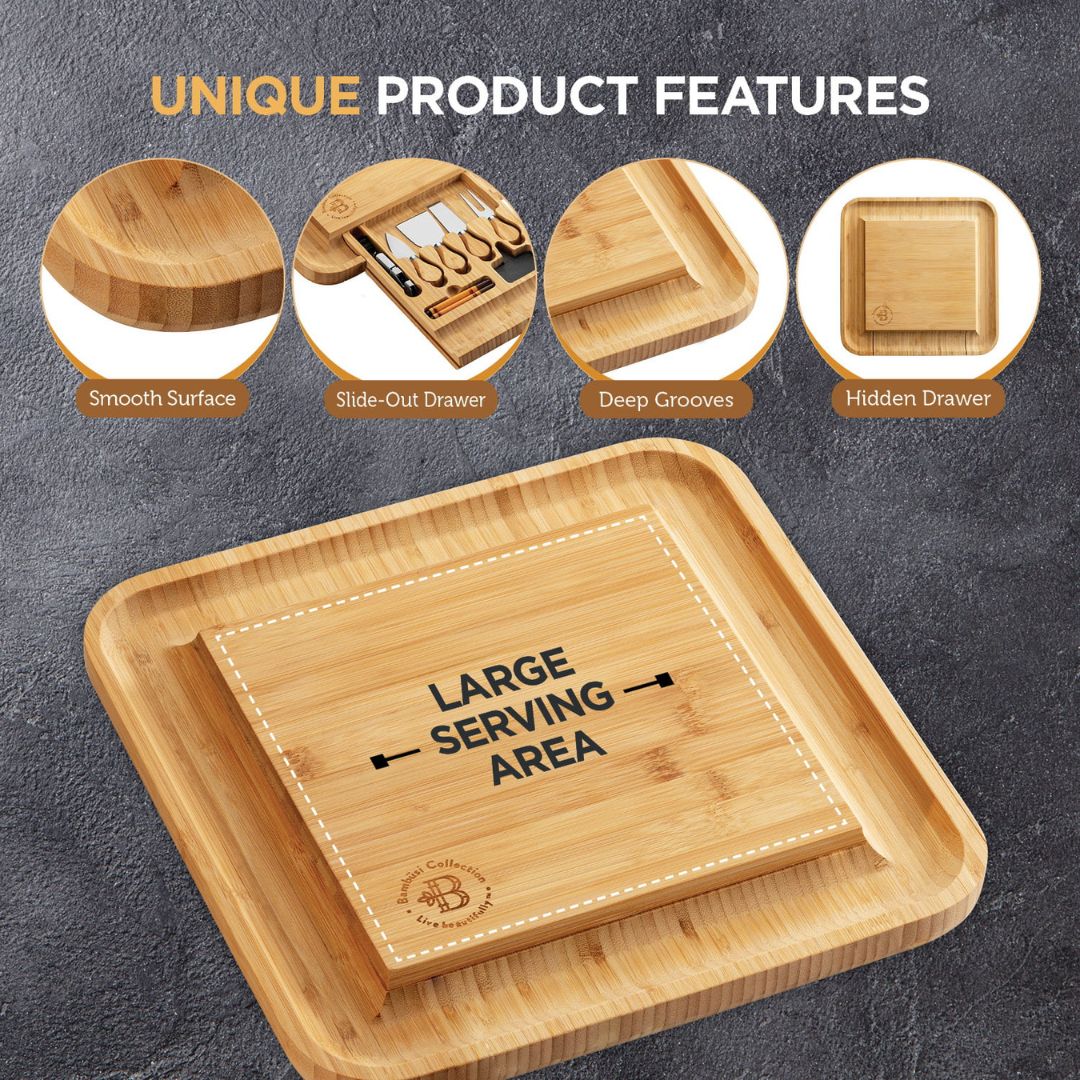 This attractive serving platter is not only a smashing accessory for those who love to entertain, it will make life easier as well with its versatile functionality. Featuring a large surface area for presenting scrumptious slices, a nifty ledge for arranging crackers, and a hidden drawer housing an array of cutting and spreading tools. Antimicrobial Moso bamboo makes it a sage, durable prep area, and striking design.
