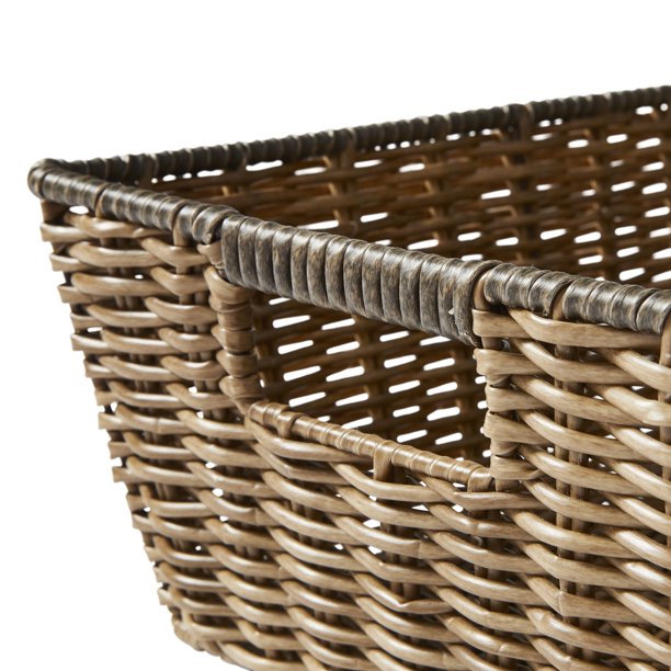 Handcrafted of sturdy iron with a durable polyethylene rattan weave, this basket is a great option for storing toiletries, cleaning supplies, remotes, small electronics, books, and much more. This versatile basket features two handles and is an asset in any indoor space. No matter your home decor style, you're sure to love this basket.The Better Homes & Gardens Poly Rattan Storage Basket with Cut-Out Handles
