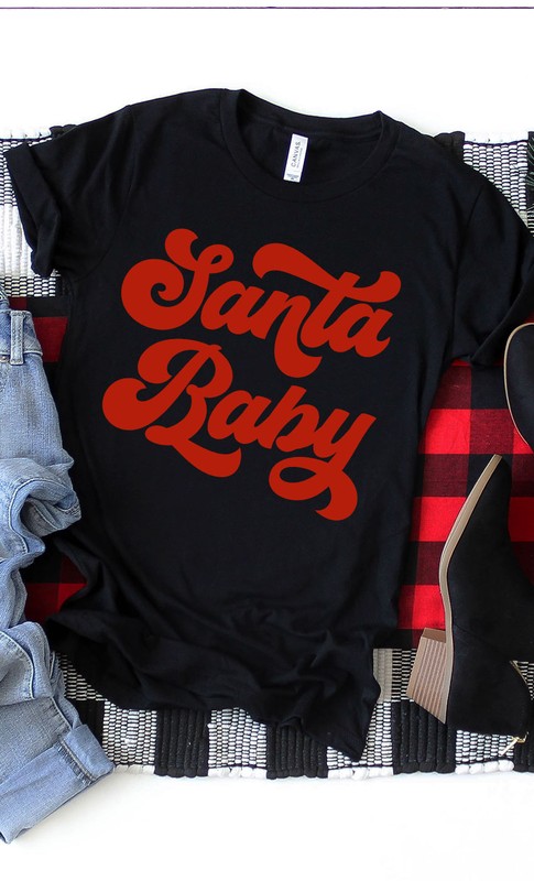 Santa Baby Graphic Tee. Most t-shirt colors are 52/48 Airlume combed and ringspun cotton/polyester, Athletic Heather & Black Heather are 90/10 airlume combed and ringspun cotton/polyester. White, cream, canvas red, lilac, mint are 100% cotton. Ash is 99/1 |